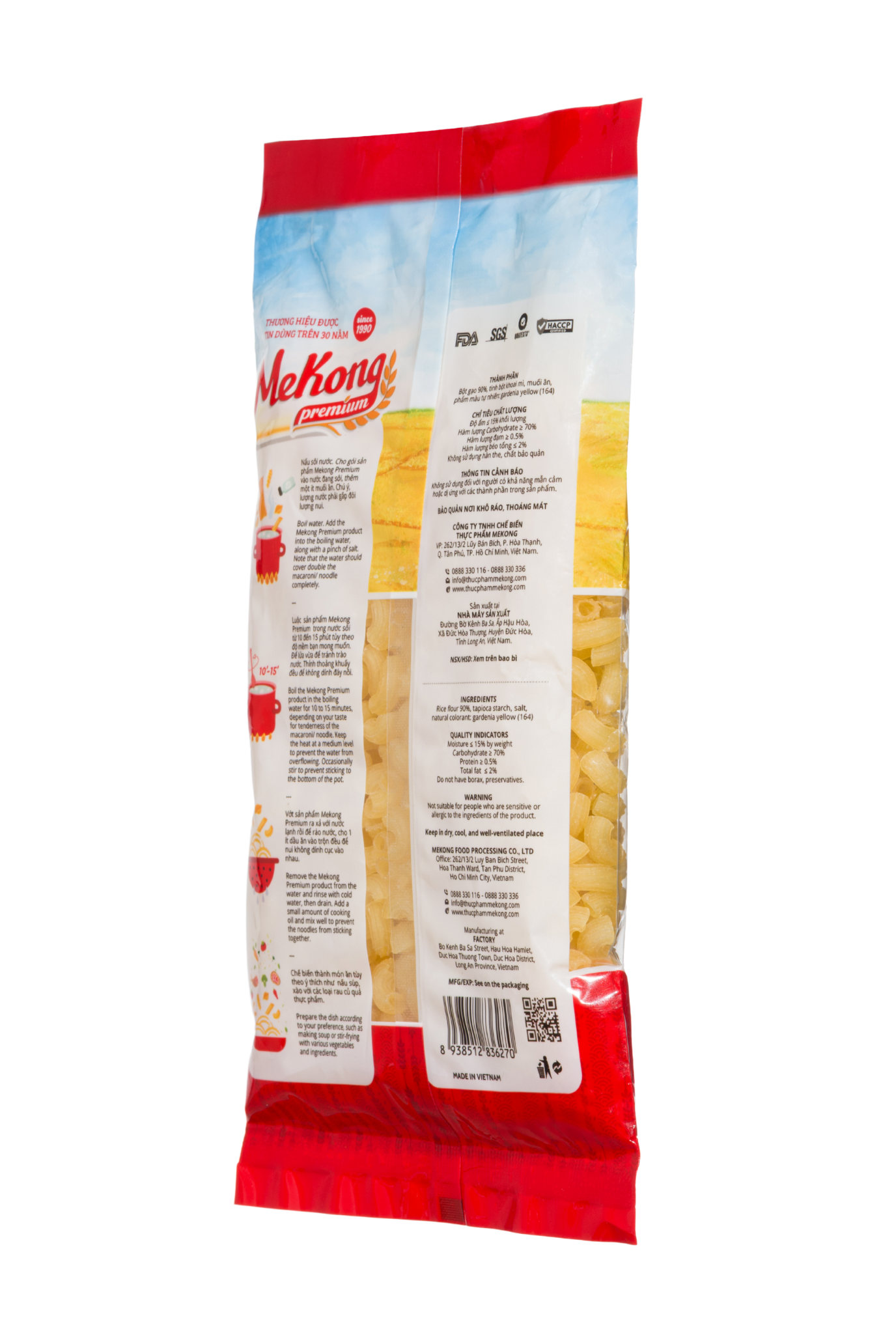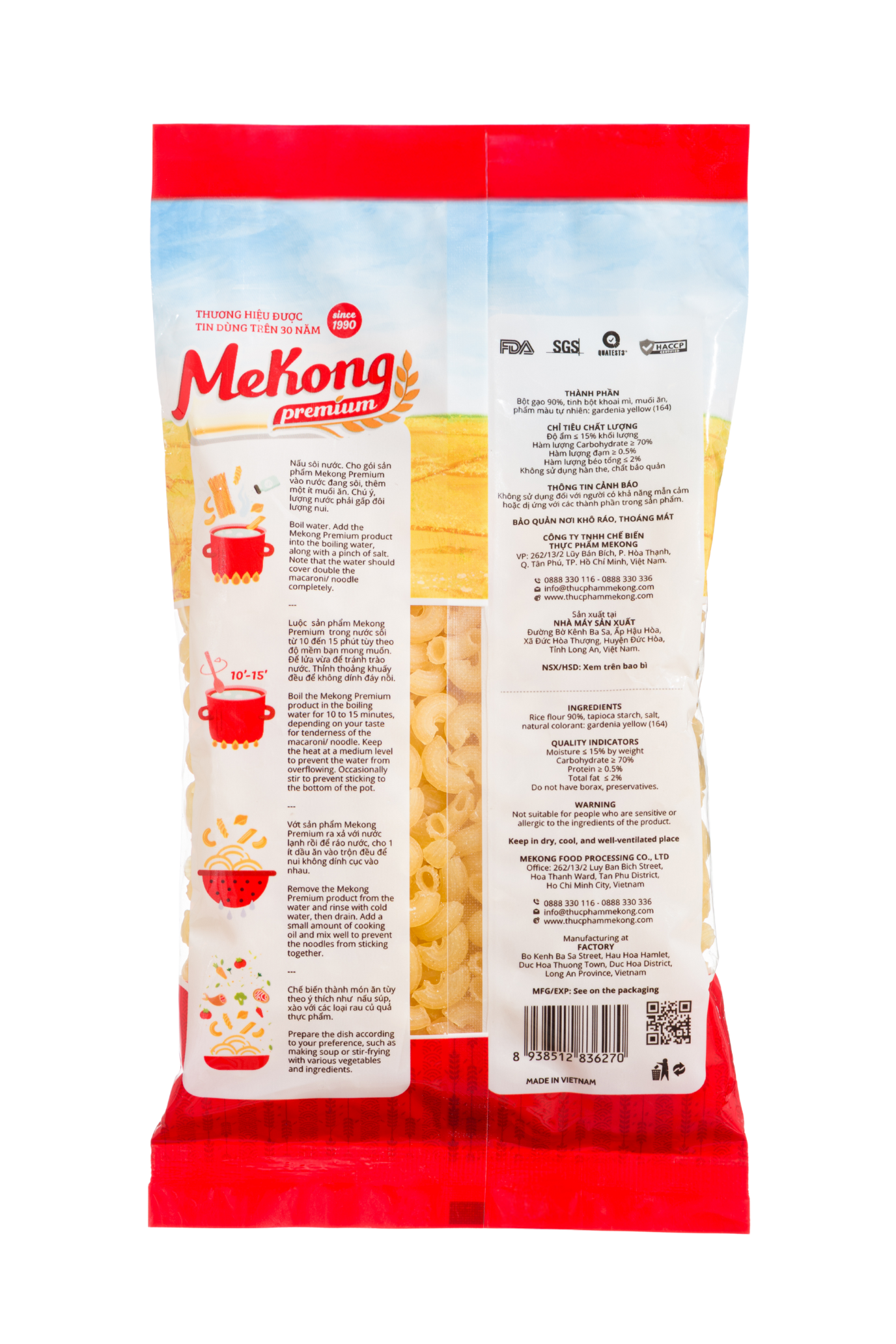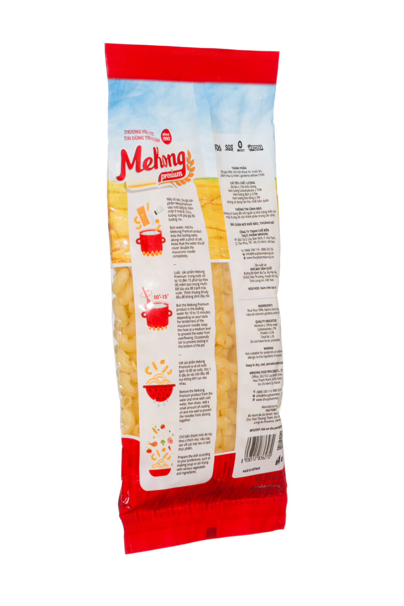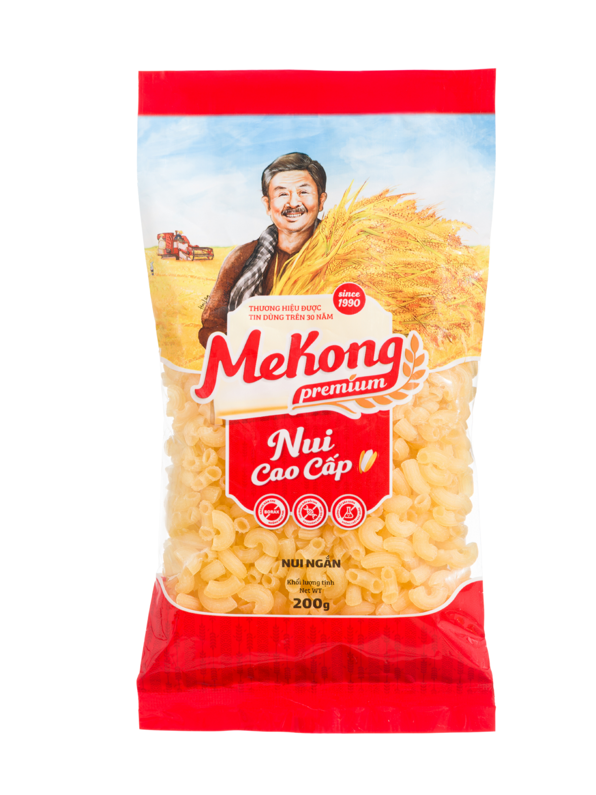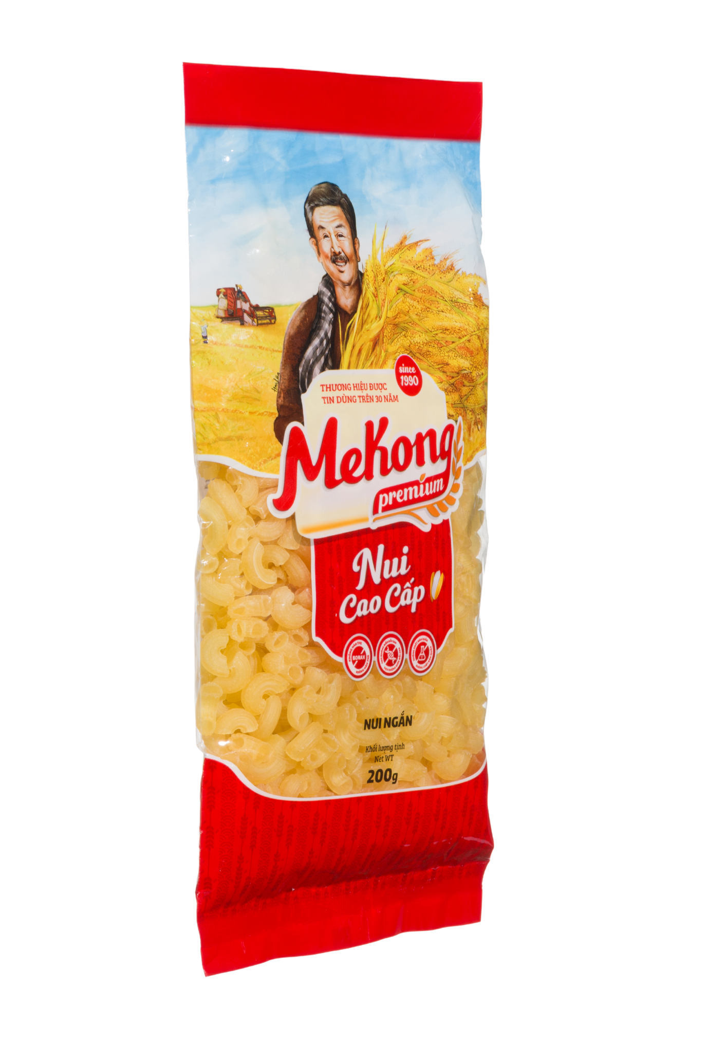 Nui vàng ống ngắn cao cấp Mekong Premium được sản xuất từ nguồn gạo đặc sản vùng đồng bằng Sông Cửu Long, đảm bảo những bữa ăn SẠCH – LÀNH – DINH DƯỠNG với tiêu chuẩn 3 không
